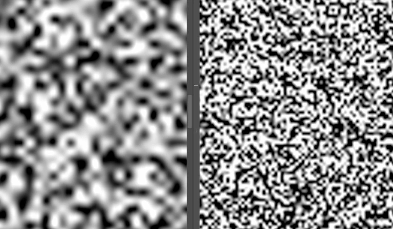 By using two different base dpi numbers, re-rastered to the same higher resolution, then blending these files together, you can create a dual-frequency texture.