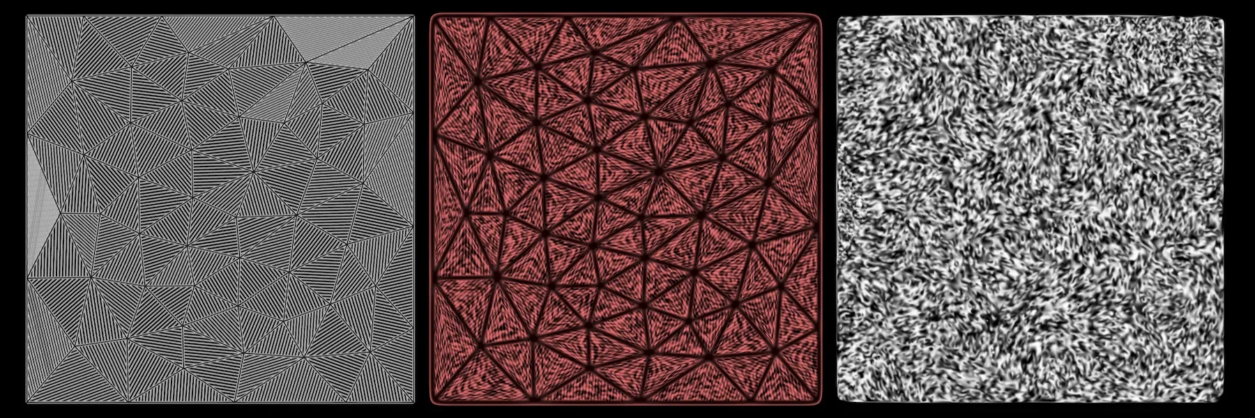 For mesh creation, randomly raise points, use a Delaunay mesh, then smooth with Weaverbird Sub Division.