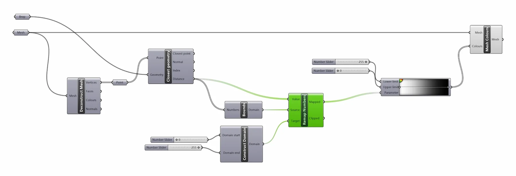 Remap these measured distances into a 0 to 255 domain, and then use the Mesh Colours component to accurately shade the surface.